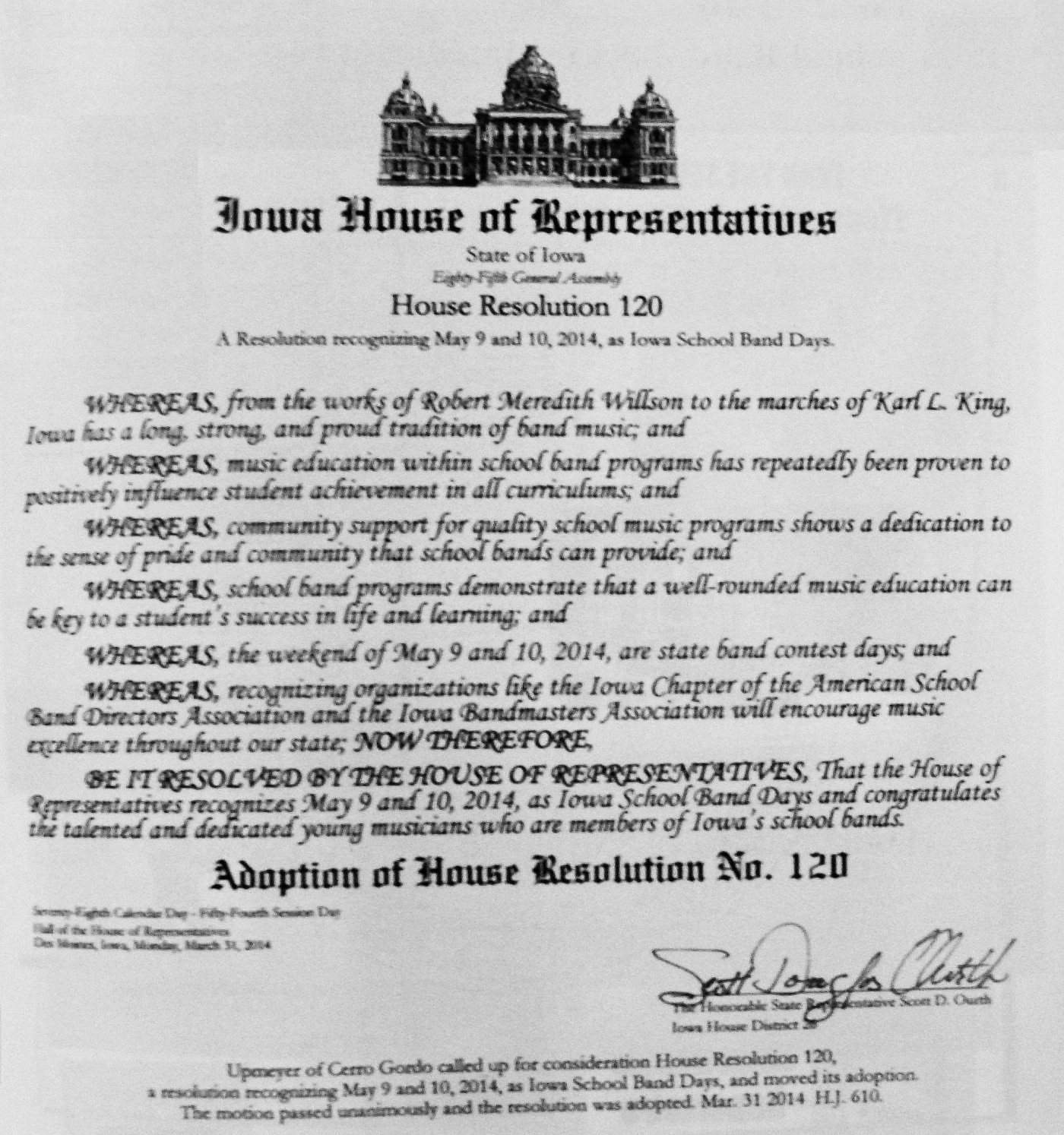 May 9th and 10th declared as Iowa School Band Days by Resolution 120