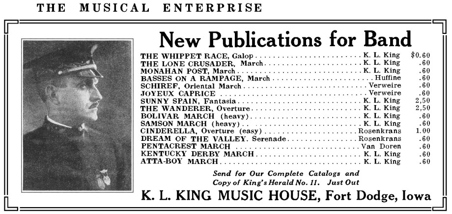 In 1919 the Kings returned to Canton where he directed the Grand Army Band of Canton, Ohio, and in 1920 Karl King gave up circus life for good when he accepted the position of conductor of the Fort Dodge (Iowa) Municipal Band. Under his leadership that band became a popular fixture at state and regional fairs, rodeos, and expositions.