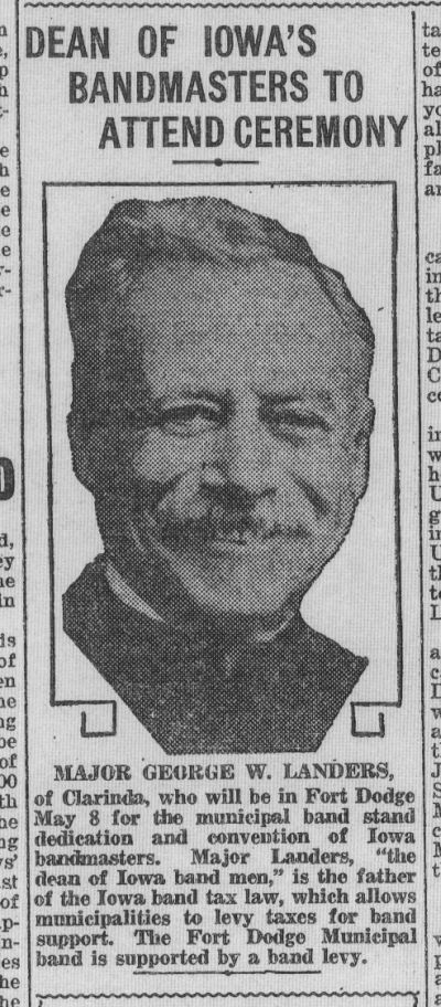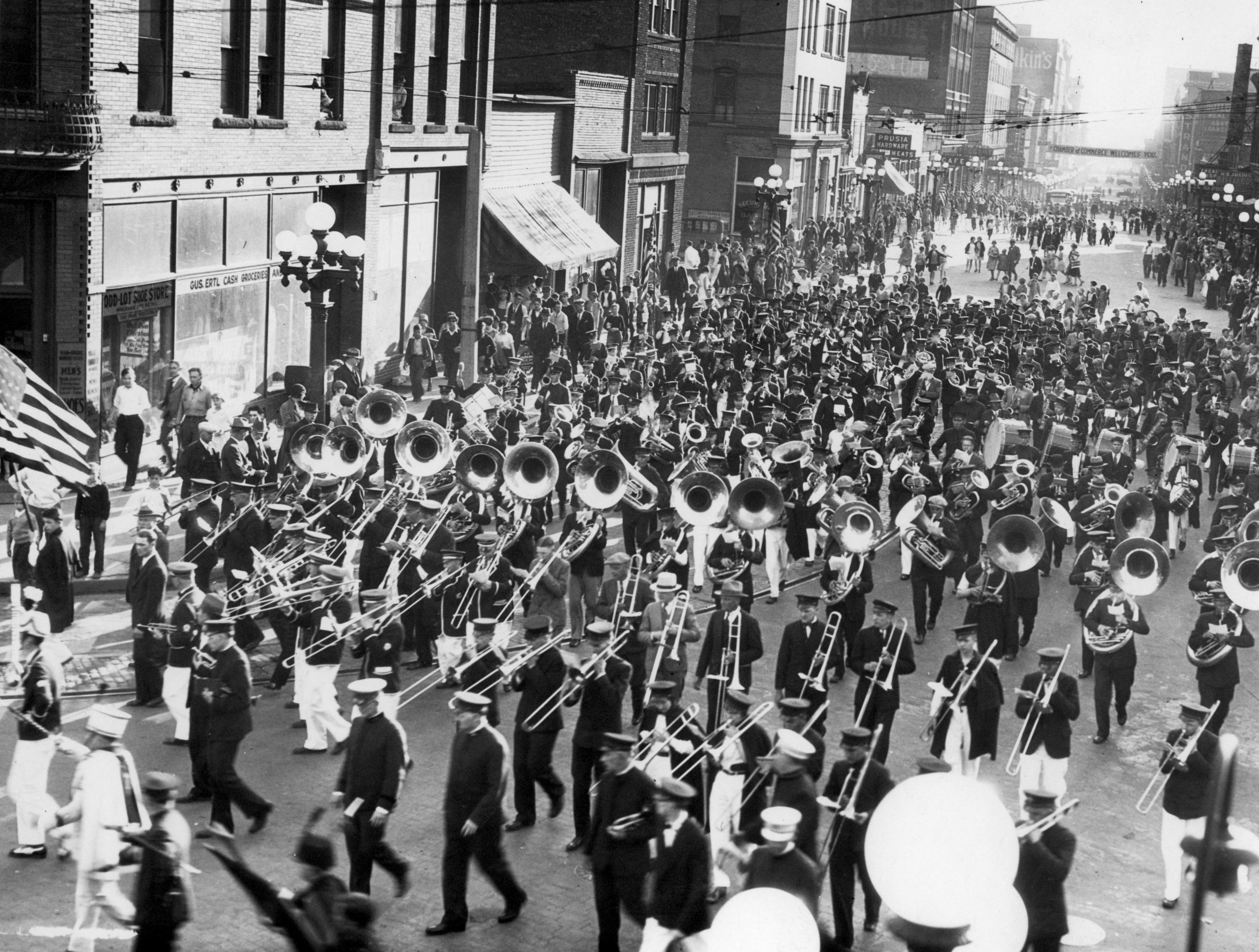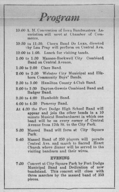 Musicians from twelve bands comprising more than 350 performers paraded down Central Avenue before playing several pieces together in front of the new bandstand. Karl King is in the dark uniform at the lower left of the photo (just to the right of the American flag). Lou Pray is pictured as the drum major leading the band.