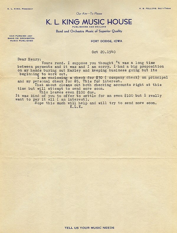 The letter above and the following letters accompanied payments on the $1000 loan from Henry Killinger which allowed Karl King to start his publishing company.