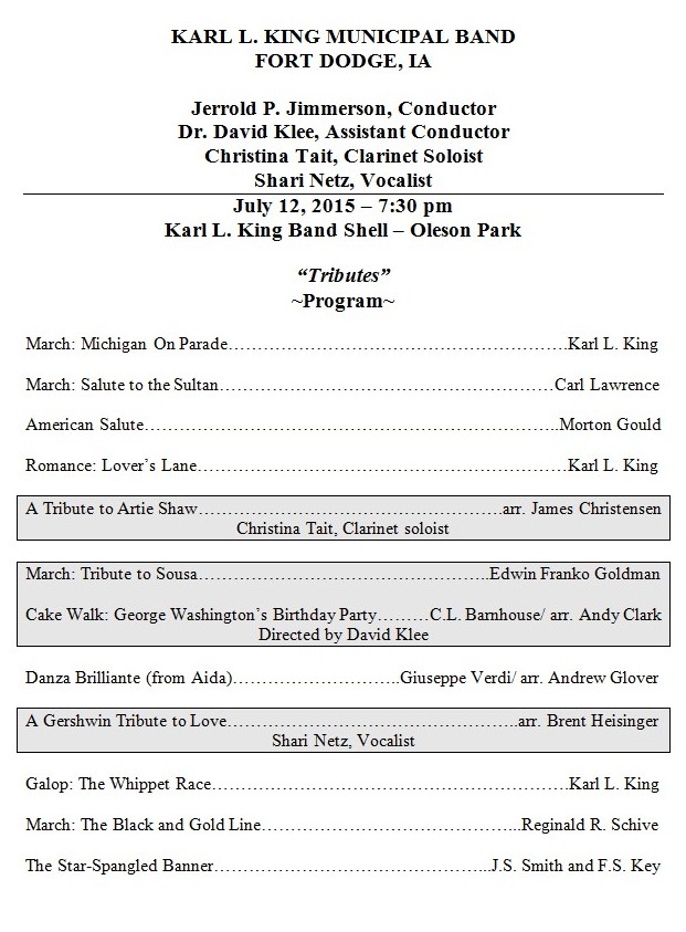 The program this week featured King’s The Whippet Race, a fast-paced circus galop dedicated to the Superintendent of Speed at the Iowa State Fair.