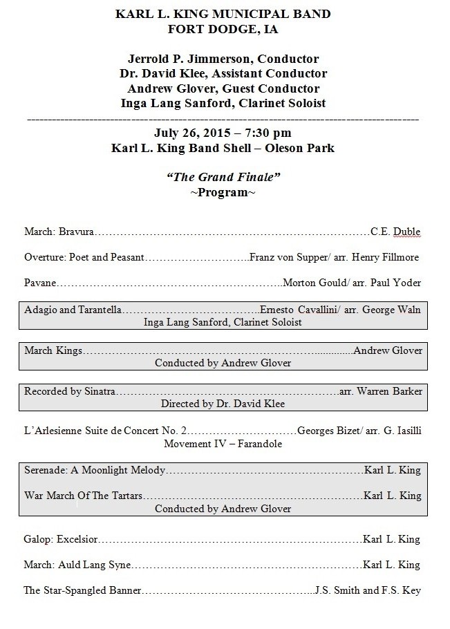 The final concert of the 2015 summer season by the Karl L. King Municipal Band of Fort Dodge was held Sunday evening, July 26 at the Karl L. King Band Shell in beautiful Oleson Park.