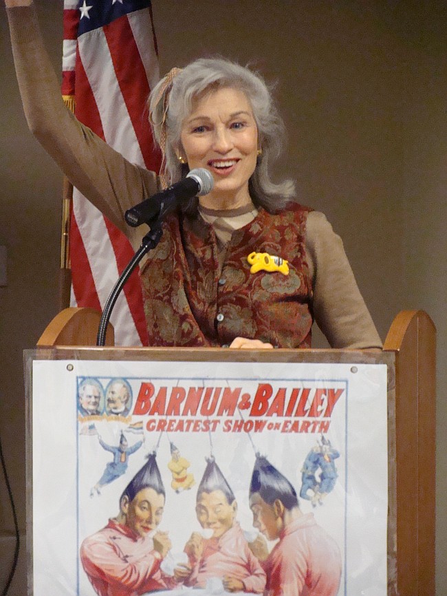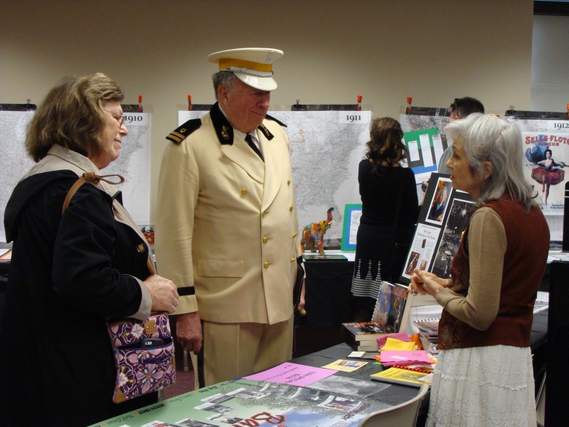 On Saturday, February 20, an open house was held at the Fort Dodge public library. This event was organized by longtime King Band member and historian Nancy Olson, assisted by her daughter Susan, both Windjammers. Nancy and Susan chose to feature music and artifacts from the earliest part of King's career: the nine years he spent trouping with various circus bands, first as a euphonium player and later as a bandmaster. Exibists showcased each year of King's circus career, including maps showing the routes King traveled during each of those nine years. In many cases, the route books, programs, advertising, and other fascinating artifacts from those years was displayed. Of course, many Karl King musical selections were displayed as well, many showing dedications to circus performers and band members King worked with during his time as a circus musician. Retired Fort Dodge music educator Larry Mitchell was on hand, attired in an authentic Karl King uniform, and in character as Mr. King. Larry gave a wonderful presentation about King's life and career, from the first person, and captured Mr. King's sense of humor as well as his humility for which he was well known. Also on hand was retired circus aerialist Sarah Chapman, whose career included tenures with Ringling Bros. Barnum and Bailey, King Bros., Carson and Barnes, and a host of other shows. Sarah spoke of the musicians with whom she worked during her career, including Bill Pruyn, Boom Boom Browning, and Illy Cervone. Sarah, a Florida native who participated in the Sailor Circus as a youth, told many engaging stories about her life and career with the circus. Present day King Band conductor Jerrold P. Jimmerson was also on hand, and brought a personal scrapbook containing many programs, news clippings, and photographs from his early years as a member of the King Band. Also in attenance was the granddaughter of Karl King, Michelle King Matlock, who travelled from her home in Indianapolis. Michelle enjoyed meeting many fans of her grandfather, and also shared many personal recollections of him. On Sunday February 21, the Karl L. King Municipal Band presented a gala 125th birthday concert at Iowa Central Community College's Decker Auditorium. Conductor Jimmerson selected a program featuring music from King's circus days. Assistant conductor Dr. David Klee conducted two selections, and vocal soloist Robert Patton performed two selections with the band. The concert was enthusiastically received by a large and appreciative crowd. The Karl King birthday concert is a tradition with the King Band, and it opens a series of three indoor winter concerts, before the band moves outdoors for its summer concert series. by Andrew Gover, WJU #423