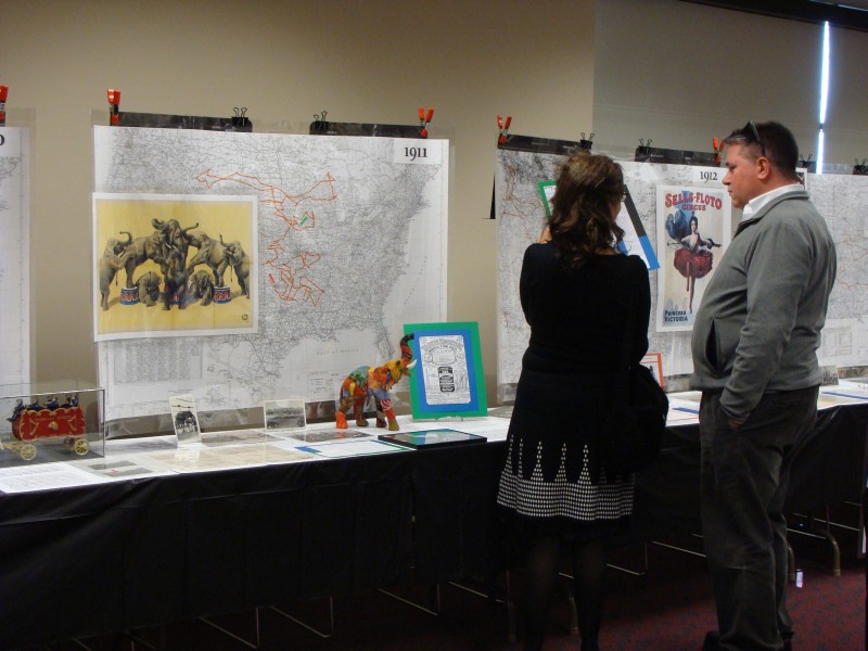 In order to help the public learn more about the life and travels of Karl King, the band historian, Nancy Olson, conductor Jerrold Jimmerson, Andrew Glover (seen above) and other band members were present for this display of vintage circus posters, route maps from the 9 years that King traveled with the various circuses, a vast collection of pictures and news articles, samples of hand-written music of Karl King, musical instruments, and some of the many other archival items the band has in their possession.