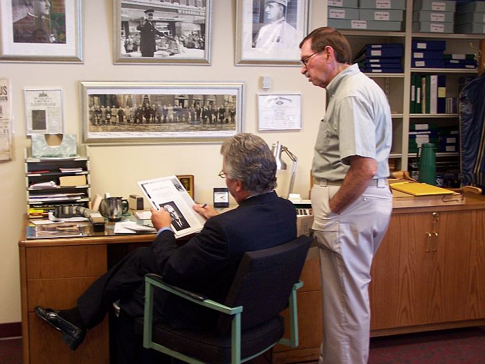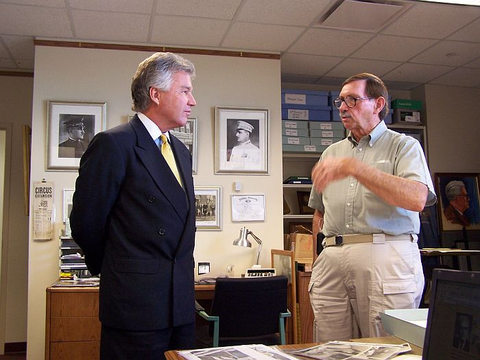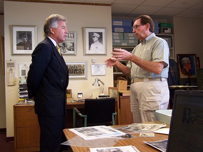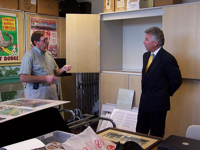 Jack Lashier, Director of Special Projects of the Iowa High School Athletic Association, traveled to Fort Dodge to learn about Karl King in preparation for a visual presentation to be displayed in the Iowa Event Center. When the Event Center opens next year in Des Moines, it will include an Iowa Hall of Pride which will feature a number of Iowa heroes including Karl King. Images and biographical information of those Iowa heroes will be presented on a large plasma screen. Duane Olson is pictured here with Mr. Lashier.