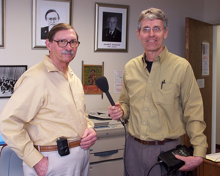 Rick Fredericksen of Iowa Public Radio is shown interviewing Oley Olson in the Karl King Archive Center. Rick was working on a segment which would include the voice of Karl King in his series of short radio broadcasts documenting historical Iowa sounds. Oley and Nancy had assembled every known significant recording of Karl King's voice in preparation for this interview which has now been aired. The segment has been archived on the WOI Radio website so all can enjoy it. Anyone aware of possible additional recordings which include Karl King's voice is encouraged to contact Duane Oley Olson at 712-297-8193.